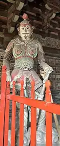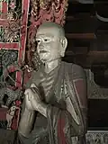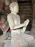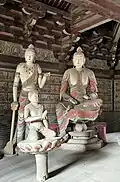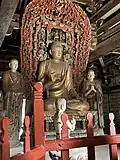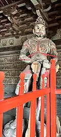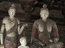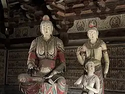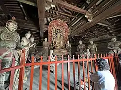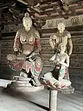 The hall contains eleven sculptures from the Northern Han period. These are the only Chinese sculptures from the period that survive from outside the Mogao Grottoes.[1] There is a main statue of Sakyamuni flanked by Bodhisattvas and the Heavenly Kings.[10]