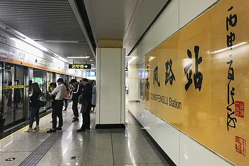Line 1 is a west–east line with a total length of 41.2 km (25.6 mi),[27] starting from Henan University of Technology and ending in New Campus of Henan University. It interchanges with Line 2 at Zijingshan. This line connects many important places or areas of the city, including Zhengzhou University, Zhengzhou railway station, Zhengdong New Area, Zhengzhou East railway station and the Longzihu College Area. CSR Zhuzhou supplied six-car Type B metro trains for Line 1 under a contract signed in January 2011.[32] The first phase, 26.2 km (16.3 mi)[33] long with 20 stations, is entirely underground and was opened in 2013.[34] On 12 January 2017, both east and west extensions of the line opened, adding 15.01 km (9.33 mi) and 9 stations to the line.[35] The color for Line 1 is red.