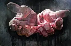 In 2021 Gershman was named an Ambassador to art materials company Royal Talens North America and art supply business BLICK Art Materials.[14] Gershman's "First Face of War: Intimate Portrait of Ukrainian Teacher" sold for $100,000 at the Heritage Auctions with 100% of proceeds from the sale benefiting Ukraine during the 2022 humanitarian crisis.[15] Gershman's painting depicts Ukrainian school teacher Olena Kurilo, who was wounded by shelling in Chuhuiv during the Russian invasion of Ukraine. The painting was modeled from a photograph of a wounded Kurilo which was taken by photojournalist Wolfgang Schwan, and inspired the creation of a movement by Zhenya, called Brushes Over Bullets.[16] In her project 'Brushes over Bullets', Gershman encourages other artists to paint in solidarity with Ukraine.[17] Gershman has said that she intentionally made her "First Face of War" small in size, so that observers are forced to take a closer and more intimate look into the eyes and faces of her subjects.[18]