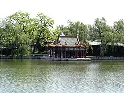 The Taiye Lake originally formed the core of an imperial garden called Western Park (Xiyuan; 西苑) or Western Court (Xinei; 西内; 西內), with parklands on the shores, enclosed by a red wall in the western part of the Imperial City. Most of the pavilions, shrines, and temples survive from this period. Whereas the Northern Sea had a religious focus, the shores of Central and Southern Seas were dotted with a number of worldly palaces.[5]