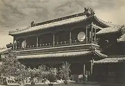 Yanqing House (延庆楼; 延慶樓), as well as several other adjoining buildings, was built during the Beiyang Government around 1922. During his time as de facto ruler of the Beiyang Government, Cao Kun used Yanqing House as his workplace while living in nearby Huairen Hall. His wives and concubines lived in several of the adjoining buildings. After Cao Kun was overthrown in 1924, he was imprisoned in Yanqing House for two years. The original Yanqing House was ultimately destroyed in a fire in 1947.[48] The KMT military commander of Beiping, Fu Zuoyi, subsequently built a series of small bungalows in this location to house military and political personnel.[49] By the early 2000s, a one-story building with two courtyards existed on the former site of Yanqing House. The building was sometimes referred to as Yanqingzhai (延庆斋).