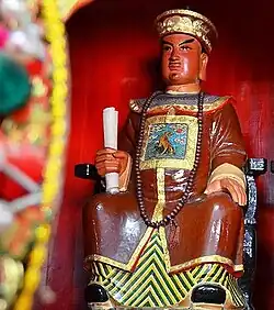 The Lords Zhou and Wang Memorial Study Hall in Kam Tin was established by the Tang clan in 1684 as a tribute to Zhou and Wang Lairen.[17] Similarly, the Temple for Two Dukes (二公祠) in Guangzhou was built in honour of Zhou and Wang.[15] The Hongsheng temple in Chaolian contains imagery of Zhou; the displaced villagers had allegedly been given divine indication, after worshipping at the temple, that they would "return home after 1,800 days", a prediction which roughly came true following Zhou's efforts.[9] Zhou and Wang were also deified at the Temple to Famous Officials in Nantou.[18] Zhou is likewise treated like a deity by Chaoshan residents, who seek advice and divine help from him; this phenomenon is dismissed as "dross superstition" by a Chaoxue[b] scholar.[19]