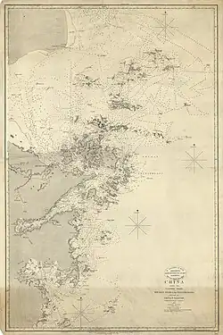 British forces under Captain Charles Elliot captured Zhoushan on July 5–6, 1840 during the First Opium War and evacuated it in early 1841, after Elliot reached an agreement with Qishan, the Governor-General of Tianjin (Tientsin) and Grand Secretary to the Daoguang Emperor, in exchange for Hong Kong.[9] At that time, Zhoushan was a well known port while Hong Kong was still only a fishing village. The British Foreign Secretary Palmerston was furious when he learned that Elliot agreed to the cede Zhoushan for Hong Kong, described as "a barren island with hardly a house on it". Elliot was dismissed in April 1841 for his blunder.[10] His replacement Sir Henry Pottinger led a British fleet that recaptured Zhoushan on October 1, 1841.[11] The First Opium War ended with conclusion of the Treaty of Nanjing in which China opened up the cities of Guangzhou ("Canton"), Fuzhou ("Foochow"), Xiamen ("Amoy"), Ningbo ("Ningpo"), and Shanghai to residence by British subjects for the purpose of trade. As a result, Britain no longer had any use for Zhoushan but it kept the island until 1846 as a guarantee for the treaty.[12] Dinghai was upgraded to a directly controlled subprefecture (定海直隸廳) sometime in 1841.