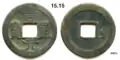 | Obverse: Scrollwork on rim. Reverse: Emblems. Char/pic square hole.[24] | Zhouyuan Tongbao (周元通寳) |