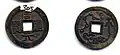 | The reverse side shows a "moon" (represented by a crescent, see "Han dynasty coinage § Dots, crescents, circles, numbers, counting rods, Chinese characters, and other symbols appearing on coins") between the square central hole and the rim at the 7 o'clock position.[16] These coin charms typically have a diameter of 24 millimeters and a weight of 3.5 grams.[16] | Zhouyuan Tongbao (周元通寳) |