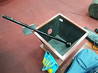 The zhu is a wooden box, typically painted red or otherwise decorated, that tapers from top to bottom.