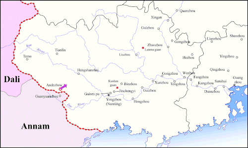 From 823 to 826, the Zhuang, Huang, and Nong clans, aided with raiders from Champa, attacked Yongzhou and seized 18 counties. The "Nung Grottoes" sought aid from Nanzhao.[23][24]