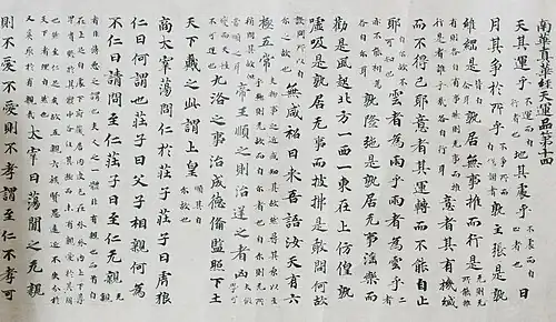 Many scholars consider a Zhuangzi composed of 52 chapters, as attested by the Book of Han in 111 AD, to have been the original form of the text.[16] During the late 1st century BC, the entire Han imperial library—including its edition of the Zhuangzi—was subject to considerable redaction and standardization by the polymath Liu Xiang (77–6 BC) and his son Liu Xin (c. 46 BC – AD 23). All extant copies of the Zhuangzi ultimately derive from a version that was further edited and redacted to 33 chapters by Guo Xiang c. 300 AD,[16] who worked from the material previously edited by Liu. Guo plainly stated that he had made considerable edits to the outer and miscellaneous chapters in an attempt to preserve Zhuang Zhou's original ideas from later distortions, in a way that "did not hesitate to impose his personal understanding and philosophical preferences on the text".[17] The received text as edited by Guo is approximately 63,000 characters long—around two-thirds the attested length of the Han-era manuscript. While none are known to exist in full, versions of the text unaffected by both the Guo and Liu revisions survived into the Tang dynasty (618–907), with the existing fragments hinting at the folkloric nature of the material removed by Guo.[18]