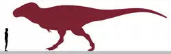Zhuchengtyrannus was a large carnivorous theropod, and the holotype has been estimated to have been "similar in size and gross morphology to Tarbosaurus",[1] which is about 10 metres (33 ft) in body length and 5 metric tons (5.5 short tons) in body mass.[5][6][7] The holotype dentary was significantly smaller than the corresponding bones of one of the largest Tyrannosaurus rex specimens ("Sue").[8]
