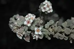 Masses of small pinkish-white flowers about 8 mm (0.3 in) in diameter are arranged in clusters of between three and seven in leaf axils. The clusters have a stalk up to 10 mm (0.4 in) and are longer than the leaves. Four large green, leaf-like bracts surround each flower cluster. The sepals are triangular, about 2 mm (0.08 in) long and covered with velvety hairs. The four petals are broad lance-shaped, about 3 mm (0.1 in) long, overlap each other and have a layer of hairs on the outside. Flowering occurs from September to October but fruit have never been observed and evidence suggests that the species has lost its ability to reproduce sexually.[2][3][4]