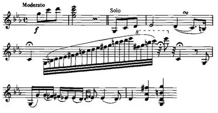 4. This section has an improvisational quality; the melody, which essentially consists of pairs of 4-bar phrases, is punctuated with difficult runs and other technically demanding figures, including flying spiccato and ricochet bowings. - Un poco più lento – The muted soloist plays a melancholic melody with the so-called reverse-applied dotted note (1/16 + dotted 1/8 rhythm: