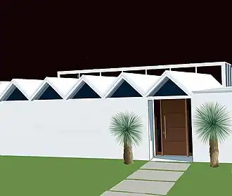 The sawtooth roof structure is made with a honeycomb material which comes from a mid-century design. Following the design elements of the Sarasota School of Architecture, the home attempts to seamlessly combine indoor and outdoor spaces.[1] The home has built-in furniture, and curved cabinetry.[3]