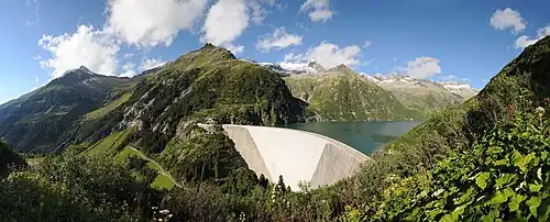 The Zillergründl Dam is an arch dam on the Ziller River in the upper Ziller Valley of Tyrol state, Austria. It lies 16 km (10 mi) east of Mayrhofen. The primary purpose of the dam is hydroelectric power generation and it supports a 360 MW pumped-storage power station. As part of the Zemm-Ziller Development, construction on the dam began in 1981 and, along with the Häusling Pumped Storage Power Plant, it was completed in 1986. The power plant was fully commissioned by 1988. The dam is the second tallest in Austria.[3]