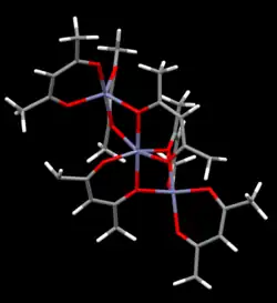 Zinc acetylacetonate is an acetylacetonate complex of zinc, with the chemical formula of Zn(C5H7O2)2. The compound is in fact a trimer, Zn3(acac)6, in which each Zn ion is coordinated by five oxygen atoms in a distorted trigonal bipyramidal structure.[5] Hydrated zinc acetylacetonate can be obtained by combining zinc sulfate, acetylacetone, and sodium hydroxide.[3]