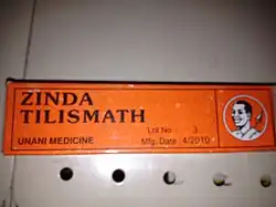 Zinda Tilismath is a Unani herbal medicine used for treating many common ailments like cold, coughs, throat pain, body pain, stomach disorders, ear pain, tooth pain and many more products. Based on the ancient herbal unani concept of medicine, Zinda Tilismath was founded by Hakeem Mohammed Moizuddin Farooqi in the year 1920. This was the period when new industries were beginning to emerge on the surface of Hyderabad and adding to Deccan's grandeur. Zinda Tilismath has a strong herbal/bitter taste, mainly consisting of eucalyptus and other various grassy notes. [1] It is an over the counter drug, which is made from selected herbs. The medicine is said to have no side effects due to its herbal composition and is based on the Unani concept of medicine. It's available across India in many medical and general shops.[2]