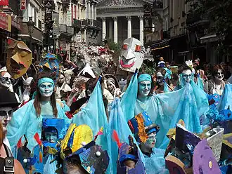 The Zinneke Parade was created for the first time as part of Brussels 2000, European Capital of Culture, with the aim of organising a multicultural carnival, a creative and participative event "likely to reconcile the Brussels population with its identity".[5] The Zinneke Parade was watched by 60,000 spectators in 2006.[1] In 2008, over 7,000 people were involved with the parade, under the theme "Eau / Water" ("Water"),[3] with 2,500 of these appearing in the parade itself.[1]