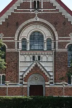 The church is designed in a Neo-Romanesque style. It is built in red brick on a granite plinth with detailing in chalk. Savonnère stone, Öland chalk and Norwegian marble has also been employed. The western gable has a round arched portal with a Tympanum framed by a triangular gable below a window group unified by a large arch. The west gable's arch frieze is a copy of the one at Hammlev Church near on Djursland.[1] Koch had previously surveyed the chalk churches of the area around Grenå and published a book about them in 1896. The sides of the building have friezes, executed in chalk by Th. Bærentsen, and are segmented by lesenes .[3]