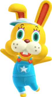 Zipper T. Bunny is a yellow rabbit with wide-open eyes and floppy ears,[1] as well as sporting a visor and blue overalls.[2][3] Zipper is seen as the mascot of Bunny Day, the Animal Crossing series' equivalent to Easter,[4] with Zipper being equated to being the Easter Bunny. Zipper is typically depicted as being in a constant state of happiness, by cheerfully hopping and frequently speaking in rhymes to the player.[5] However, if out of view of the player, Zipper will become exhausted and tired,[1] even expressing displeasure for his job.[5]