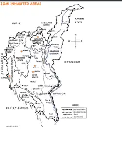 They are spread out in the contiguous regions of Northeast India, Northwest Burma (Myanmar), and the Chittagong Hill Tracts in Bangladesh. In India, they are most prominent in Manipur, Nagaland, Assam and Mizoram. Some fifty Kuki/Zo peoples are recognised as scheduled tribes.[9]