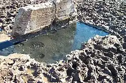 Located on the northern slope of Mount Zodletone, the Zodletone Spring is an artesian spring that features a National Science Foundation (NSF) microbial observatory.[6][2][14] First described by Havens in 1983,[6] the spring is a sulfide-rich and strictly anaerobic hydrocarbon seep that operates at low temperatures.[2] The spring discharges approximately 2.11 gallons per minute over a distance of about 22 yards,[15] where the water flows north over Stinking Creek[16][17] into nearby Saddle Mountain Creek.[18][4] The spring is a closed area of approximately 1 square meter filled with biomass and soft sediments to a depth of at least 6 inches.[17] The spring water has a sulfide content of 8–10 mmol/L[19][20] and contains 1.0–1.5 mmol of zero valent sulfur.[17] The salinity, measured by the concentration of sodium chloride, is around 0.7–1.0%,[15] which is significantly less than seawater (approximately 3.5%). These measurements, in the mats formed by the microbes, increase to 2–5%, and in the soil they can reach up to 25–30% at a depth of 2 in and 12 in, respectively.[15] The hydrocarbons detected in high concentrations are short-chain alkanes, such as methane, ethane, and propane.[15]