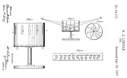William Ensign Lincoln invented the definitive zoetrope in 1865 when he was about 18 years old and a sophomore at Brown University, Providence, Rhode Island. Lincoln's patented version had the viewing slits on a level above the pictures, which allowed the use of easily replaceable strips of images. It also had an illustrated paper disc on the base, which was not always exploited on the commercially produced versions. On advice of a local bookstore owner, Lincoln sent a model to color lithographers and board game manufacturers Milton Bradley and Co.[11] Some shop owners advertised the zoetrope in American newspapers in December 1866.[17] William E. Lincoln applied for a U.S. patent for his Zoëtrope on July 27, 1866[18] as an assignor to Milton Bradley, and it was granted on April 23, 1867.[19] It was also patented in the United Kingdom of Great Britain and Ireland on June 7, 1867 (application March 6, 1867) under no. 629, by Henry Watson Hallett (as a communication to him by Milton Bradley),[11] and in the Second French Empire by Charles William May (filed May 14, 1867).[18]