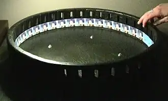 Émile Reynaud's 1877 praxinoscope was an improvement on the zoetrope that became popular toward the end of the 19th century.[50] It replaced the zoetrope's narrow viewing slits with an inner circle of mirrors that intermittently reflected the images.[51]