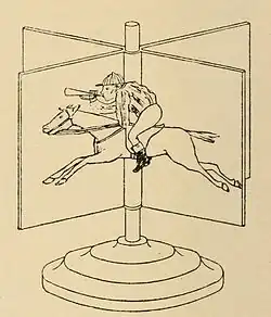 After taking notice of Joseph Plateau's invention of the phénakisticope (published in London as "phantasmascope") British mathematician William George Horner thought up a cylindrical variation and published details about its mathematical principles in January 1834.[10] He called his device the Dædaleum, as a reference to the Greek myth of Daedalus.[11] Horner's revolving drum had viewing slits between the pictures, instead of above as the later zoetrope variations would have. Horner planned to publish the dædaleum with optician King, Jr in Bristol but it "met with some impediment probably in the sketching of the figures".[10]