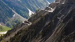 Zoji La Tunnel is an under-construction Himalayan tunnel in India under the Zoji La pass the between Sonamarg in Ganderbal district of Jammu and Kashmir and Dras in Kargil district of Ladakh. It is 9.5 m wide, 7.57 m high and 14.2 km long, horseshoe-shaped single-tube, 2 lane road tunnel at the height of around 12,000 feet above sea level. Together with the adjacent Z-Morh Tunnel, this geostrategically important tunnel on the NH1 Srinagar-Leh Highway will provide year around weather-proof connectivity to Ladakh and Baltal (Amarnath cave), reduce the earlier 1-1.5 hours travel time to just 15 minutes drive, boost the tourism and economy, and enhance the logistics of the Indian Armed Forces. It is one of the 31 road tunnels (20 in J&K and 11 in Ladakh) being constructed at a combined cost of INR1400 billion (~US$17.5 billion).[1][2][3] Upon completion it will become the longest tunnel in Asia.[4]