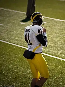 As a senior, Meskó once punted a ball 70 yards in the air.[23] As a senior punter and placekicker, Meskó was a part of the focus of opposition game plans.[24] He averaged 44 yards per punt as a senior and dropped 16 inside the 10-yard line according to The Plain Dealer and 15 inside the 15-yard line according to the Ann Arbor News.[12][25] He was selected to play on 15 January 2005 U.S. Army All-American Bowl as a punter.[26] During the game, he drew a roughing the kicker penalty and posted seven punts including kicks of 56, 48 and 47 yards and a pooch punt that he placed inside the 15-yard line.[27] He was named an Associated Press Division II All-Ohio first-team punter.[28] He was also selected to numerous local area All-star teams as both a punter and a placekicker. He served as both punter and kicker for the Ohio team during the 2005 Big 33 Football Classic in which he was 4 for 5 on PATs.[29][30] He was recognized as the 2004 Northeast Inland All-District Division II first team punter by the media.[31] He was selected as the All-Akron Beacon Journal team placekicker and the all-Summit County punter.[32][33] The Akron area coaches selected him as both the punter and kicker for the All-Western Reserve Conference, North Division first-team.[34] He was selected to the combined Summit-Medina-Portage Counties All-Area team as the first team punter by The Plain Dealer.[35] He was the first team punter for The Plain Dealer All-area team.[36] Although Meskó's high school required 40 hours of community service, he performed over 300 hours.[12]