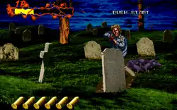 The player travels through five stages and must shoot zombies and other monsters along the way before being hit by their attacks (gunshots, knives, axes, etc.). Innocent bystanders appear frequently; if they are shot, the player suffers a health penalty. Pieces of the scenery such as gravestones and windows can be destroyed to reveal weapon power-ups and bonus items. The player starts the game with a standard handgun, but stronger weapons such as shotguns, machine guns, and fire rifles can be found; however, if the player is hit or shoots a bystander, any weapon power-ups are lost. The player's controller is a pump-action shotgun mounted to the cabinet. When a weapon's ammunition supply runs out, the player must pump the fore-end to reload.