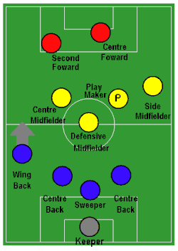 In zona mista, there are four defenders. A sweeper is free to roam and assist other defenders. A fullback plays in both defensive and advanced position, typically on the left flank. The two stoppers, who started then to be called "centre back", mark their zones. In the midfield, there are a defensive midfielder, centre midfielder and the playmaker (#10) and a winger who covers typically the right flank and sometimes acts as an additional striker. Zona Mista employs a two-prong attack. A centre forward plays upfront. A second striker plays wide to the left (a derivation of catenaccio's left winger) and drifts inside to act as a striker or to cover the playmaker when the playmaker drops into a defensive position.