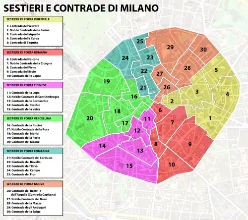 As many cities in Italy, the historic centre of Milan is also subdivided into many historical sestieri, medieval subdivisions themselves subdivided into different contrade.