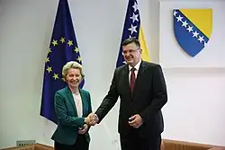 At a Council of Ministers session held on 23 June 2021, Tegeltija's cabinet, much to his disapproval, supported a new law regarding the High Judicial and Prosecutorial Council of Bosnia and Herzegovina (VSTV BiH), a legal solution, which is a condition for obtaining European Union candidate status, as well as other tranches of EU microfinance support.[48] On 30 June, Tegeltija spoke in a telephone call with German chancellor Angela Merkel about the future of EU potential enlargement, ahead of the 2021 Berlin Process Summit.[49] On 14 September 2021, Tegeltija met in person with Merkel at a Western Balkans meeting in Tirana, Albania, where they talked about the COVID-19 pandemic, Berlin Process, EU enlargement and the political situation in Bosnia and Herzegovina.[50] On 30 September, alongside Andrej Plenković and European Commission president Ursula von der Leyen, Tegeltija opened the Svilaj border checkpoint and a bridge over the nearby Sava river, which bears the internationally important freeway Pan-European Corridor Vc.[51] In November 2022, alongside other Western Balkans leaders and in the presence of German Chancellor Olaf Scholz, Tegeltija signed three agreements on mobility at the Berlin Process Summit, which enable travel with an ID card in the region, mutual recognition of university diplomas and professional qualifications.[52] On 15 December 2022, during his premiership, Bosnia and Herzegovina was recognised by the European Union as a candidate country for accession following the decision of the European Council.[53]