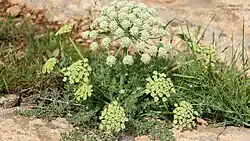 They are herbaceous plants, biennial or monocarpic perennials.[2] They have thick,[3] yellow-red roots that are fusiform (rod-shaped). The stem is usually solitary, densely pubescent (has soft downy hairs), angled, corymbose-branched (branches arising at different points but reaching about the same height). The base of the stem is clothed in fibrous remnant sheaths. It has 1-2 leaves that are pinnatisect.[2] The upper leaves are narrowly elliptic.[3] The flower or inflorescence is compound umbels.[2] They have 10-25 rays.[3] The bracts and bracteoles are present,[2] and linear to lanceolate (in shape).[3] The flowers are hermaphrodite with calyx teeth minute. The petals are whitish,[3] obcordate (broad and notched at the tip), with a narrow apex, inflexed and the outer petals are slightly enlarged (radiant). The fruit (or seed capsule) is broadly ovate, strongly dorsally compressed, densely minute-pubescent. The dorsal ribs are filiform (thread-like) with the marginal ribs broadly thin-winged. The distal parts are inflated and corky. The outer mesocarp layer is parenchymatous (a versatile ground tissue composed of living primary cells) and the inner layer is sclerified (thick, lignified, cell wall that is shorter than a fiber cell). The vittae (resin canals) are large, 1 in each furrow, 2 on commissure. The seed face is plane with a carpophore 2-parted to base.[2]