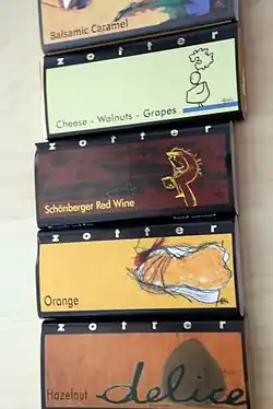 Zotter Schokolade is an Austrian chocolate manufacturer specializing in organic and fairly traded bean-to-bar chocolate. The company was founded in 1999 by Josef Zotter and is based in Riegersburg, Styria.[2][3] Zotter is mostly active in German-speaking Europe, with 90 percent of distribution outlets being located in Germany, Switzerland, and Austria.[1] As one of Austria's most well-known trademarks, Zotter is considered a national high equity brand.[4][5][6]