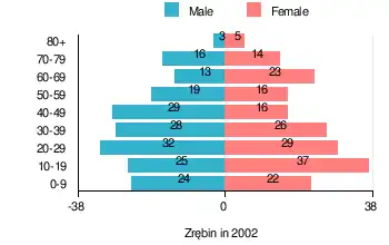According to the 2002 Poland census, there were 377 people residing in Zrębin village, of whom 50.1% were male and 49.9% were female. In the village, the population was spread out, with 26.3% under the age of 18, 40.3% from 18 to 44, 15.6% from 45 to 64, and 17.8% who were 65 years of age or older.[1]