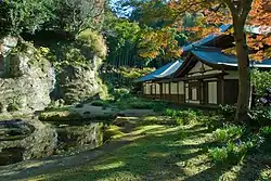 Kinbyōzan Zuisen-ji (錦屏山瑞泉寺) is a Buddhist temple of the Rinzai sect in Nikaidō's Momijigayatsu Valley (紅葉ヶ谷, Valley of the Autumn Leaves) in Kamakura, Japan.[1] During the Muromachi period it was the family temple of the Ashikaga rulers of Kamakura (the Kantō kubō): four of the five kubō are buried there in a private cemetery closed to the public[1][2] and first kubō Ashikaga Motouji's is also known by the name Zuisen-ji-den (瑞泉寺殿).[3] Designed by prominent Zen religious figure, poet and Zen garden designer Musō Soseki (also known as Musō Kokushi), the temple lies on top of an isolated hill and is famous for both its garden and its Zen rock garden.[4] The beauty and the quantity of its plants have gained it since antiquity the nickname "Temple of Flowers" (花の寺).[1] The main object of worship is Jizō Bosatsu.[5] Zuisen-ji is an Historic Site and contains numerous objects classified as Important Cultural Properties and Places of Scenic Beauty.[6]