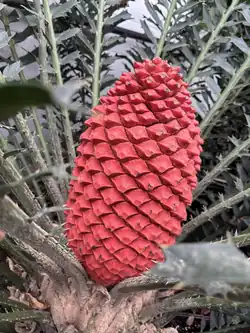 E. ferox is reported to grow relatively fast compared to members of other cycad genera, but are considered slow-growing when compared to other orders and classes.[3] E. ferox reproduces using cones that are of a dark salmon color, as opposed to the greenish coloration typical of other cycads.[7] It shares this coloration with E. gratus, although the two species likely evolved this condition independently.[6] The cones are sexually dimorphic: the male cone is a 40 to 50 cm long cylinder that is 7 to 10 cm wide with a peduncle that is up to 2 to 3 cm long; the female cone is 25 to 50 cm long, 20 to 25 cm wide, and sessile. Males can have up to ten cones at one time and females can have up to five cones at one time.[3] The cones also emerge in succession, rather than emerging simultaneously.[8] The shields of the megasporophylls are pyramidal shaped, with flattened facets.[3] The seeds, which are about 4.5 to 5 cm long and 1.5 to 2 cm wide, are red, narrow, oblong and glossy.[4]