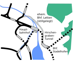 With the opening of the Zurich S-Bahn in 1990, the Letten Tunnel was replaced by the Hirschengraben Tunnel, which provided a direct route under the Limmat to Stadelhofen through new low-level platforms at Zurich HB .