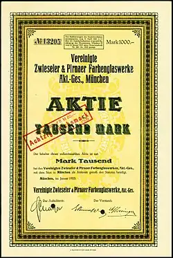 On 1 September 1899, a glass plant in Pirna was acquired for 675,000 marks and the company was renamed the Vereinigte Zwieseler und Pirnaer Farbenglaswerke AG. The share capital was increased to 1,200,000 marks. The Zwieseler plant supplied antique glass, so-called "Pirna Kathedralglas".