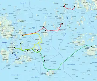 - Södra linjen (zuidelijke lijn): Långnäs - Överö - Sottunga - Husö of Kyrkogårdsö - Kökar - Galtby (Korpo, Finland)