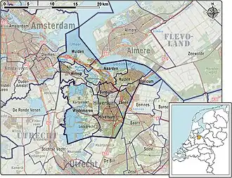 - De fusiegemeente Wijdemeren, met als plaatsen 's-Graveland, Loosdrecht, Nederhorst den Berg, Ankeveen en Kortenhoef, bestaat grotendeels uit veenweidegebied. Zij wordt tot Gooi en Vechtstreek gerekend; hiervan ligt de kern Nederhorst den Berg (inclusief de kern Overmeer) aan de Vecht, terwijl de overige kernen meer aansluiten bij Het Gooi.