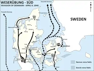 Na 4 maanden opstellen en trainen in de Brdy heuvels en bij Perleberg, verhuisde de divisie naar haar eerste oorlogsmissie naar Sleeswijk-Holstein. Van daaruit rukte de divisie in het kader van Operatie Weserübung samen met de 170e Infanteriedivisie vanaf 9 april 1940 Denemarken binnen. De hoofdtaak was de bezetting van Kopenhagen en de eilanden Seeland en Funen, en de tweede taak was de bezetting van Bornholm.