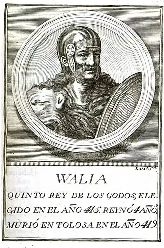 - Wallia (r. 415-418) volgt zijn broer Athaulf op als koning van de Visigoten. Hij sluit een vredesverdrag met keizer Honorius en laat tijdens de onderhandelingen Galla Placidia terugkeren naar Rome, in ruil voor voedseltransporten.