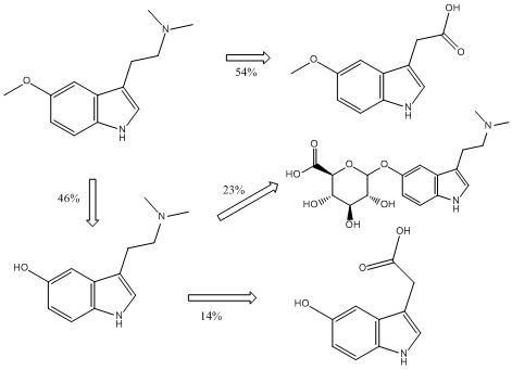 De enige onderzoeken naar de metabole wegen van 5-MeO-DMT zijn uitgevoerd bij ratten (Sprague-Dawley).[11] De metabole routes omvatten onder andere oxidatieve deaminering, N-demethylering, O-demethylering en N-oxidering.[12] Uit onderzoek blijkt dat 5-MeO-DMT voor ruim de helft (54%) wordt omgezet in 5-methoxyindoolazijnzuur (via N-demethylering en deaminering). De rest van de gevonden metabolieten zijn het gevolg van eerst O-demethylering van 5-MeO-DMT naar bufotenine, dat gedeeltelijke verdere biochemische transformaties ondergaat naar 5-hydroxyindoolazijnzuur (14%) (via N-demethylering en deaminering) en bufotenineglucuronide (23%) (via conjugatie). De metabolieten werden gevonden in de urine en ontlasting. Onderstaande figuur[11] biedt een grafische weergave van de metabolieten: