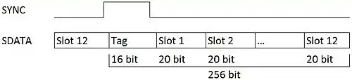 De AC97-standaard maakt gebruik van een seriële interface. De data wordt bit per bit verzonden over de datalijnen op het ritme van de klok, die werkt op een frequentie van 12,288 MHz.