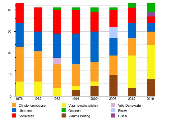 Onderstaande grafiek toont de evolutie van de zetelaantallen binnen de Aalsterse gemeenteraad.