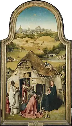 Het stelt het Driekoningen-verhaal voor. Het is een zeer getrouwe kopie van het middenpaneel van Bosch' Driekoningen-drieluik in het Museo del Prado in Madrid. Slechts enkele details zijn 'verbeterd'. De plooien, bijvoorbeeld, zijn golvend in plaats van hoekig gemaakt. Het grootste verschil is de horizon. Deze is op het schilderij in Aken verlaagd tot de nok van de stal. De landschapspartijen in de achtergrond zijn als gevolg daarvan achter elkaar weergegeven in plaats van boven elkaar.