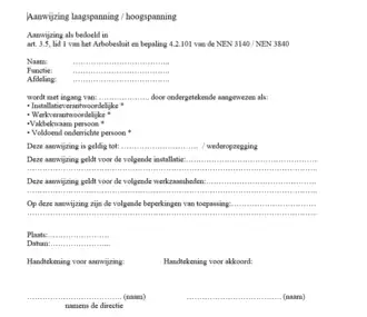 Een aanwijzing in de elektrotechniek is een geschreven verklaring die een werknemer van zijn werkgever ontvangt. In deze aanwijzing staat gespecificeerd welk niveau de persoon krijgt, en welke werkzaamheden de persoon mag uitvoeren.