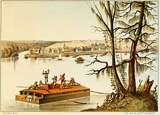 Platbodem op de Mississippi bij dorp in Louisiana, ca. 1847, lithografie door Henry Lewis